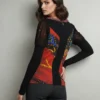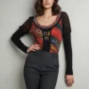 Esta blusa destaca por su diseño artístico y contemporáneo, combinando un frente decorativo en tonos rojo, naranja y azul con motivos geométricos y abstractos, contrastando con mangas largas en negro liso. El cuello en V está realzado con detalles texturizados . Elaborada en materiales que sugieren confort y movimiento, es ideal para ocasiones semi-formales, reuniones creativas o eventos sociales. Sus características destacadas incluyen la combinación de texturas, el contraste cromático y los detalles ornamentales que la convierten en una prenda versátil y llamativa para mujeres con estilo sofisticado.