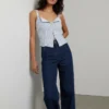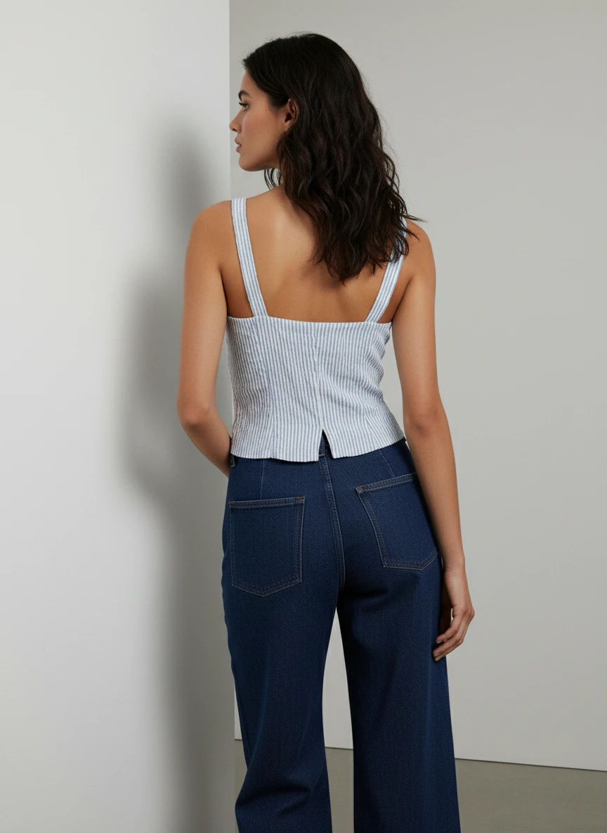 Blusa crop de rayas azules y blancas con cierre de cordones frontales. Diseño ajustado con tirantes y escote en V. Perfecta para looks casuales modernos.