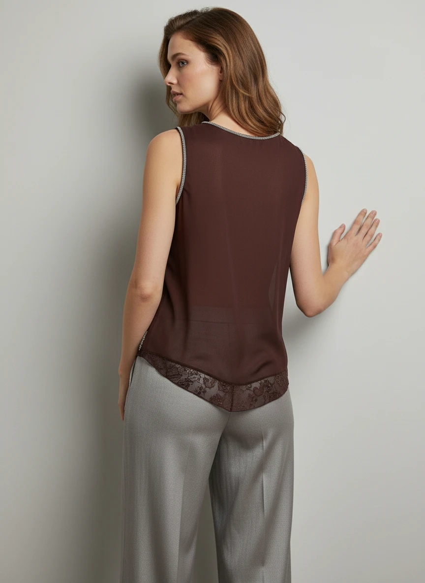 Esta elegante blusa sin mangas combina un diseño sofisticado con comodidad. Presenta un hermoso estampado floral en tonos crema que contrasta con su base marrón chocolate, creando un efecto visual muy atractivo. El escote en V favorecedor y la silueta ligera la hacen versátil para múltiples ocasiones, desde ambientes profesionales hasta encuentros casuales. Aparentemente confeccionada en un tejido suave y fluido que proporciona movimiento natural. Sus bordes ribeteados aportan un acabado pulido. Combina perfectamente con pantalones grises o jeans, siendo ideal para primavera y verano.