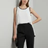 Blusa sin mangas en blanco puro con detalle de ribete negro en cuello y sisas. Diseño minimalista perfecto para looks casuales y profesionales.