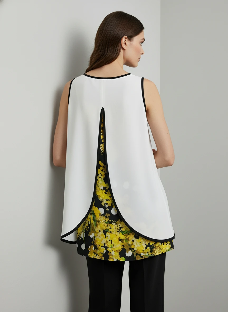 Esta blusa minimalista combina simplicidad con sofisticación. Confeccionada en un material suave de aspecto fluido, presenta un corte limpio sin mangas con ribetes negros contrastantes en el cuello redondo y las sisas. Su color blanco puro la convierte en una pieza versátil ideal para crear outfits de oficina, casual chic o eventos semi-formales. El contraste cromático proporciona un toque moderno y estructurado, mientras que la silueta holgada ofrece comodidad sin sacrificar elegancia. Perfect para capas o usar sola durante todas las estaciones.