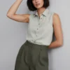 Blusa sin mangas en beige natural con botones frontales. Diseño minimalista y versátil, perfecta para looks casuales y profesionales. Tejido fresco y ligero.