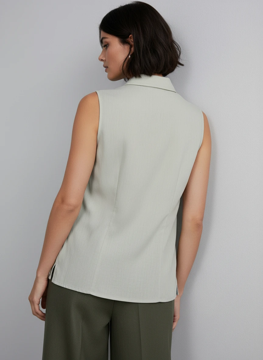 Esta blusa sin mangas destaca por su elegancia minimalista y versatilidad. Confeccionada en lino o algodón de textura suave, presenta un color beige neutro que combina fácilmente con cualquier prenda. Cuenta con cierre de botones frontales metálicos y cuello clásico tipo camisero que aporta sofisticación. Su corte recto y ajustado permite una silueta favorecedora. Ideal para ambientes profesionales, casuales o smart casual, se adapta perfectamente a diferentes ocasiones. Las mangas ausentes la hacen especialmente cómoda en climas cálidos, mientras que su estilo atemporal garantiza su permanencia en el armario.