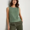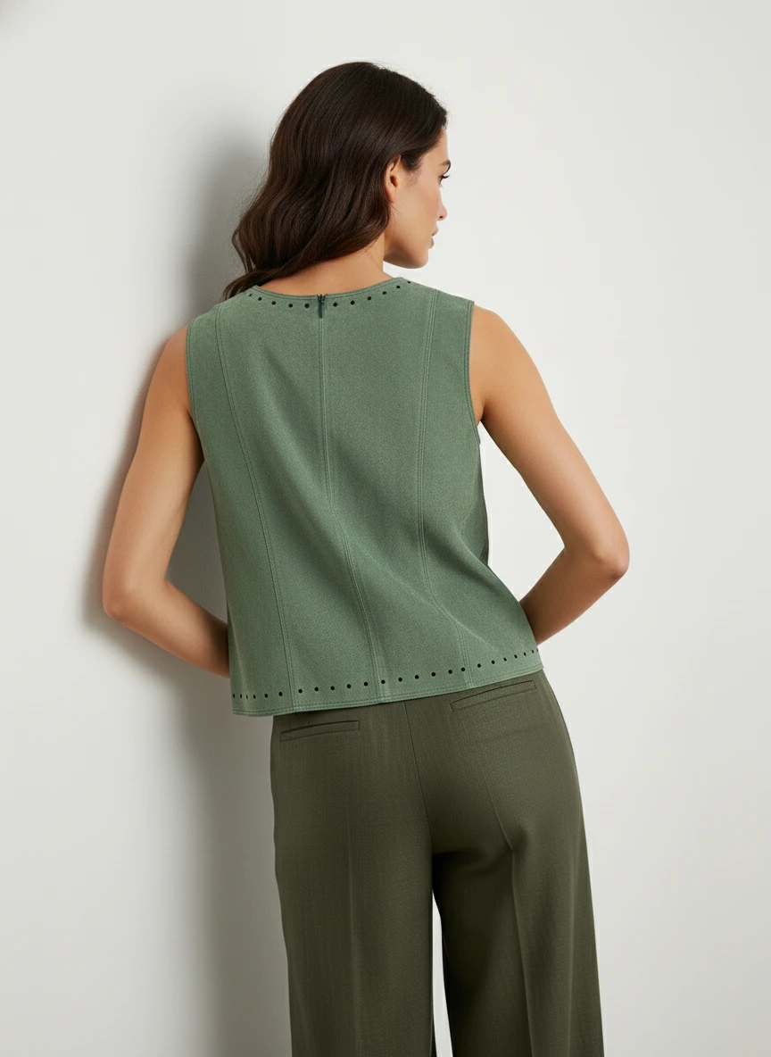 Blusa sleeveless en verde salvia con elegantes detalles perforados en cuello y bajo. Diseño minimalista perfecto para looks casual y profesionales.
