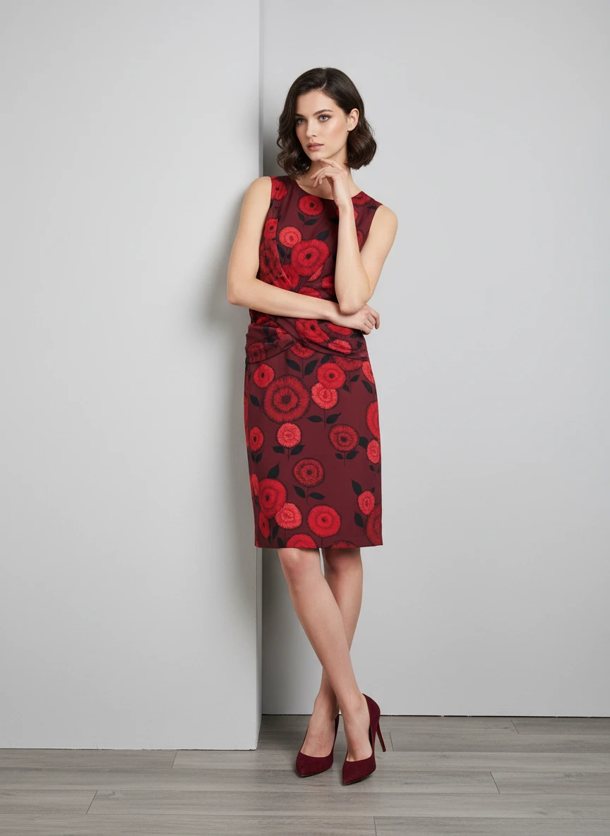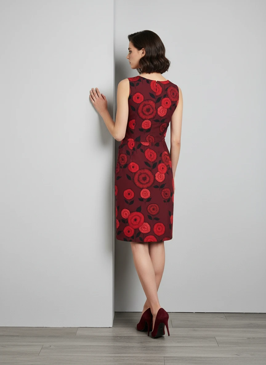 Este sofisticado vestido combina elegancia clásica con un toque moderno. Confeccionado en un material de calidad aparentemente algodón o mezcla de fibras naturales, presenta un hermoso estampado floral en tonos rojos vibrantes sobre una base burdeos profunda. El corte sin mangas es refinado y favorecedor, con un largo midi que llega hasta la rodilla. Las flores estampadas en diferentes tamaños crean un patrón dinámico y atractivo. Ideal para bodas, eventos corporativos, cócteles y ocasiones especiales, este vestido destaca por su versatilidad y sofisticación. Se complementa perfectamente con tacones a juego y accesorios minimales para un look impecable.