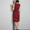 Vestido midi floral en tonos burdeos con estampado de flores rojas. Diseño elegante sin mangas, perfecto para ocasiones especiales y eventos formales.