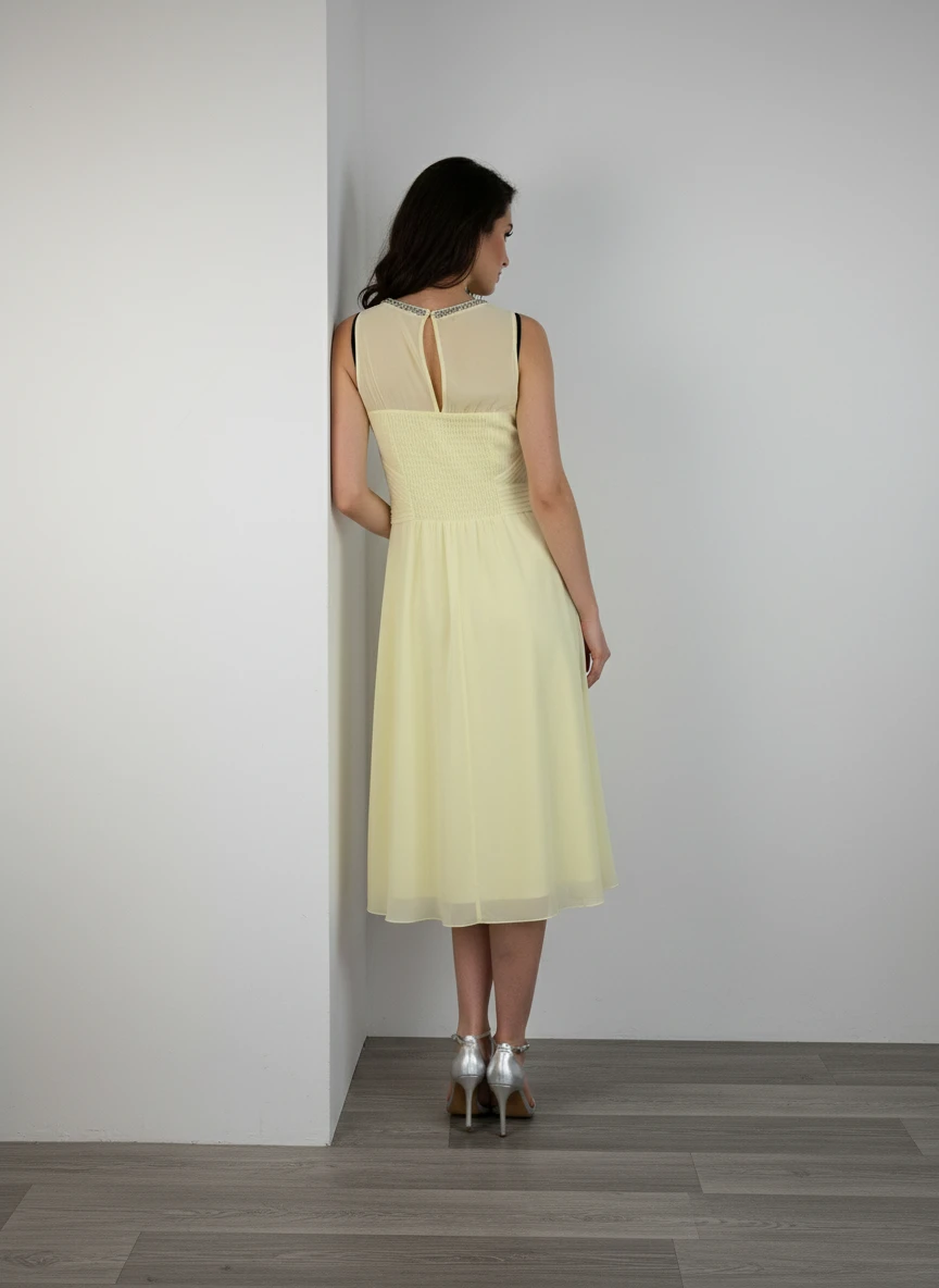 Vestido amarillo claro con sofisticado cuello de cristales. Corte imperio con drapeado en la cintura, perfecto para eventos especiales y ocasiones formales.