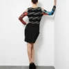 Este sofisticado vestido fusiona elementos contemporáneos con un toque artístico. El top presenta un vibrante estampado geométrico en rojo, azul y blanco que contrasta con la falda negra con drapeado elegante. Las mangas asimétricas en denim desteñido añaden una dimensión urbana y moderna. Su cuello redondo y diseño de hombro descubierto crean un efecto visual dinámico. Perfecto para eventos cocktail, salidas nocturnas o reuniones de moda. Las características más destacadas incluyen la combinación de texturas variadas, el contraste cromático audaz y el corte arquitectónico que favorece la silueta. Ideal para quién busca un look innovador y diferenciador.