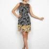 Este vestido destaca por su diseño único que mezcla dos estilos contrastantes. La parte superior presenta un patrón de texto blanco sobre fondo negro con un delicado encaje puntillista transparente en el escote. La falda inferior muestra un vibrante bordado floral en tonos dorados, naranjas y multicolores que aporta dinamismo. Confeccionado en un material de buena calidad que drapa elegantemente, ideal para bodas, cócteles y eventos formales. El cinturón metalizado define la cintura, creando una silueta favorecedora. Un diseño sofisticado y versátil que combina arte gráfico con feminidad floral.