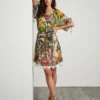 Elegante vestido estampado con motivos tropicales, mangas abullonadas y ribete de encaje. Perfecto para ocasiones especiales con un toque bohemio y sofisticado.