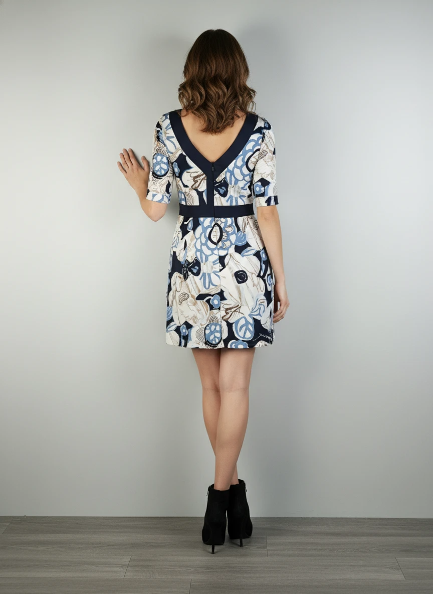 Vestido estampado con flores en azul, beige y negro. Diseño sofisticado con cinturón negro, mangas cortas y escote redondo. Perfecto para ocasiones especiales.