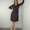 Este elegante vestido combina un diseño fluido con un estampado de lunares dispersos en tonos coral, beige y rosa sobre una base negra. Confeccionado en un material suave y ligero que cae con soltura, presenta mangas largas y un escote redondo que aporta feminidad. La silueta recta y relajada lo hace cómodo y favorecedero. Ideal para ocasiones casuales, eventos diurnos o looks de entretiempo. Destaca por su versatilidad, permitiendo combinaciones con diferentes accesorios. El detalle de apertura trasera añade un toque moderno y sofisticado a este básico versátil del guardarropa.